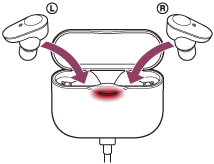 - Polnjenje slušalk in ohišja za polnjenje se zaključi v približno 3,5 urah (*) in indikatorska lučka (rdeča) na ohišju za polnjenje se samodejno izklopi. Ko odprete pokrov ohišja za polnjenje po končanem polnjenju, indikatorska lučka (rdeča) na slušalkah sveti nekaj časa.