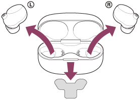 Vratite levu jedinicu slušalica sa mikrofonom (jedinicu sa opipljivom tačkom) u levi otvor kutijice za punjenje, a desnu jedinicu slušalica sa mikrofonom vratite u desni otvor kutijice za punjenje. Svaka jedinica slušalica sa mikrofonom biće postavljena u ispravan položaj u kutijici za punjenje pomoću ugrađenog magneta.