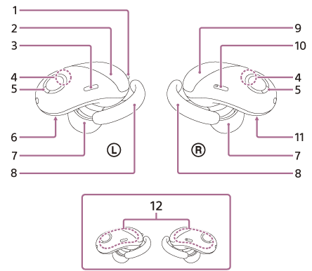 Registreert uw stemgeluid (wanneer u telefoneert) en geluid (wanneer u de ruisonderdrukkingsfunctie gebruikt). Gebruik de microfoon van de linker oorschelp wanneer u telefoneert. - Indicator (blauw/rood)