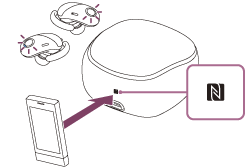 - Dacă atingeți un smartphone compatibil cu funcția NFC de partea din spate a husei de încărcare, smartphone-ul întrerupe conexiunea Bluetooth cu orice dispozitiv curent și se conectează la setul de căști (Comutarea conectării printr-o singură atingere).