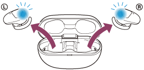 Quando emparelhar o sistema de auscultadores com um dispositivo pela primeira vez após a compra ou após uma inicialização do sistema de auscultadores (se o sistema de auscultadores não possuir as informações de emparelhamento), o sistema de auscultadores entra automaticamente no modo de emparelhamento quando for retirado da caixa de carregamento. Neste caso, coloque o sistema de auscultadores em ambos os ouvidos e avance para o passo 3.
