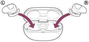 Vratite levu jedinicu slušalica sa mikrofonom (jedinicu sa opipljivom tačkom) u levi otvor kutijice za punjenje, a desnu jedinicu slušalica sa mikrofonom vratite u desni otvor kutijice za punjenje. Svaka jedinica slušalica sa mikrofonom biće postavljena u ispravan položaj pomoću ugrađenog magneta.