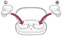 Levo enoto slušalk (enota z otipljivo piko) vstavite v levo odprtino v ohišju za polnjenje in desno enoto slušalk vstavite v desno odprtino v ohišju. Enota slušalk se bo usedla v pravilen položaj s pomočjo vgrajenega magneta.