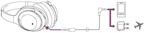 إذا قمت باستعمال سماعة الرأس في مكان يمنع فيه استعمال الأجهزة المجهزة بخاصية Bluetooth مثل الطائرة، يمكنك استعمال سماعة الرأس على أنها سماعات مع وظيفة إلغاء الضوضاء عن طريق توصيل جهاز ما عبر كبل سماعة الرأس المرفق وتشغيل سماعة الرأس.