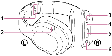 Pokud chcete sluchátka nabít, položte sluchátka na procesor, přičemž zarovnejte jednotlivé nabíjecí konektory. - Hmatová tečka (pro odlišení levé strany)