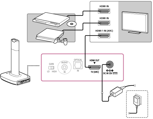 Gebruik de volgende verbindingsmethode wanneer u via de hoofdtelefoon de audio beluistert van een tv die uitgerust is met ARC. Om de processor aan te sluiten op een tv die niet uitgerust is met ARC, raadpleegt u "Verbindingsvoorbeeld 2: verbinding maken met een tv die niet uitgerust is met ARC (verbinding maken met een tv via een optische digitale kabel)".