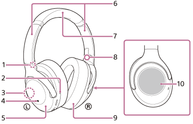 Дає змогу підключити гарнітуру до комп’ютера або USB-адаптера змінного струму (доступного в продажу) за допомогою кабелю з роз’ємом USB Type-C з комплекту постачання, щоб зарядити гарнітуру. - Гніздо INPUT