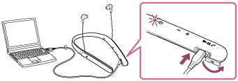 - Със слушалките не може да се работи (включване, BLUETOOTH сдвояване и свързване, възпроизвеждане на музика и др.), докато се зареждат или ако продължат да бъдат свързани с компютъра след приключване на зареждането.