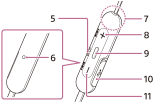 Syttyy punaisena tai sinisenä ilmaisemaan kuulokkeiden virta- tai yhteystilan. - Mikrofoni