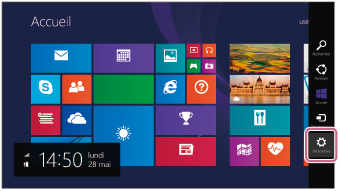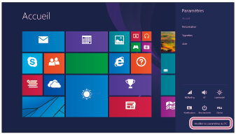 - Placez le pointeur de la souris dans le coin supérieur droit de l’écran (si vous utilisez un écran tactile, balayez l’écran en partant du bord droit), puis sélectionnez [Paramètres] dans la barre d’icônes.
