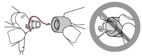 - Nástavce slúchadiel si pevne vložte celou dĺžkou do uší. Neupevňujte nástavce slúchadiel uvoľnene ani pod uhlom.