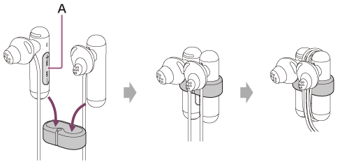 Az egységet úgy helyezze el a tokban, hogy a +/– gombot (A) belülre nézzen, majd tekerje köré a kábelt az alábbi ábrán látható módon.