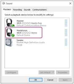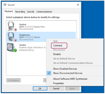 如果[MDR-XB70BT]未显示,请在[Sound]画面上右键单击,然后选择[Show Disabled Devices]。