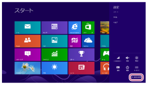 - 画面の右上隅にマウスポインターを合わせて(タッチパネルの場合は画面の右端からスワイプして)、表示されたチャームから[設定]を選択する。