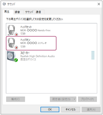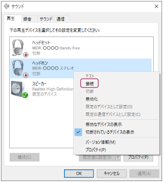 [サウンド]画面に[MDR-XB80BS]が表示されていない場合は、[サウンド]画面上で右クリックし、[切断されているデバイスの表示]にチェックを入れてください。