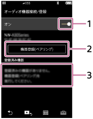 設定]–[Bluetooth]–[オーディオ機器接続/登録]の順に選ぶ。 - (1)[オン]になっていることを確認し、(2)[機器登録(ペアリング)]を選択してから、(3)[MDR-XB950N1]を選択する。
