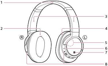 S’allume en rouge ou en bleu pour indiquer l’état de l’alimentation ou de la communication du casque.