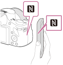 • Pokrenite aplikaciju PlayMemories Mobile na pametnom telefonu, a zatim polagano pomaknite pametni telefon prema oznaci (N mark) na proizvodu.