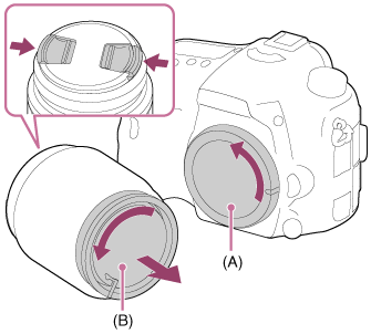 - Ta av husskyddet (A) från kameran och det bakre objektivlocket (B) från den bakre änden av objektivet.