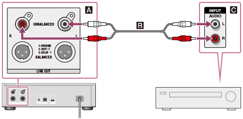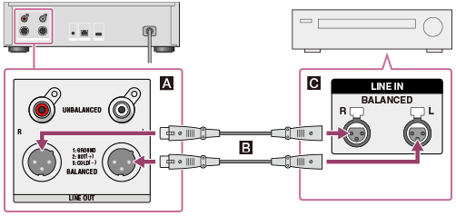 - Når du kobler en forsterker til HDD AUDIO PLAYER med de balanserte XLR-kablene, påvirkes ytelsen mindre av støykilder i nærheten.
