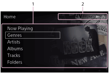 Du kan velge en meny på startskjermen eller kontrollere statusen for HDD AUDIO PLAYER ved hjelp av ikonene som vises på startskjermen.