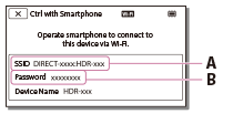 - Εκκινήστε το PlayMemories Mobile και, στη συνέχεια, στην οθόνη του smartphone, επιλέξτε το SSID που εμφανίζεται στην οθόνη LCD της συσκευής. Μετά, εισαγάγετε τον κωδικό πρόσβασης στην οθόνη LCD της συσκευής.