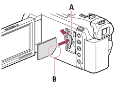 - Įsitikinkite, kad atminties kortelę dedate tinkama kryptimi. Jei atminties kortelę netinkama kryptimi įdėsite per jėgą, galite sugadinti atminties kortelę, atminties kortelės lizdą arba vaizdo duomenis.