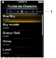 L'index affiche une liste des noms des pistes ou des albums, avec une lettre de l'alphabet. Naviguez dans l'index en appuyant sur les touches