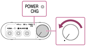 - Hörlursförstärkaren har ett laddningsbart litiumjonbatteri, men kan enbart användas när den är ansluten till ett vägguttag via DC IN 5V-porten med USB-nätadaptern (medföljer) och mikro-USB-kabeln (medföljer). Det laddningsbara litiumjonbatteriet kompletterar strömförsörjningen från USB-nätadaptern och ger förbättrad ljudkvalitet. När hörlursförstärkaren är avstängd, laddas batteriet och POWER/CHG-indikatorn lyser röd.