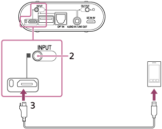 - Sätt INPUT-reglaget i läget för Xperia/WALKMAN/PC (USB AUDIO)-anslutningsporten (längst till vänster).