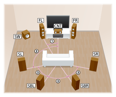- Jei naudojate 7 kanalų (6.1) jungtį, galinį erdvinio garso garsiakalbį pastatykite už klausymo vietos.