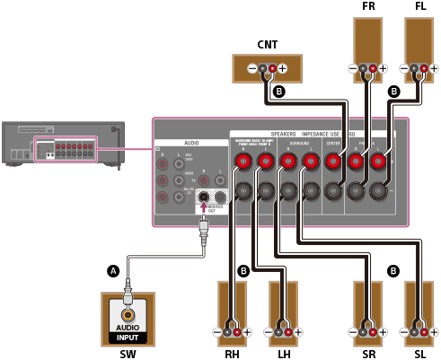 Pentru detalii cu privire la conectarea cablurilor de boxe la receptor, consultaţi „Conectarea cablurilor boxelor”.