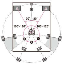 Τοποθετήστε τα πίσω περιφερειακά ηχεία όπως απεικονίζεται στην παρακάτω εικόνα. Οι γωνίες που απεικονίζονται στο