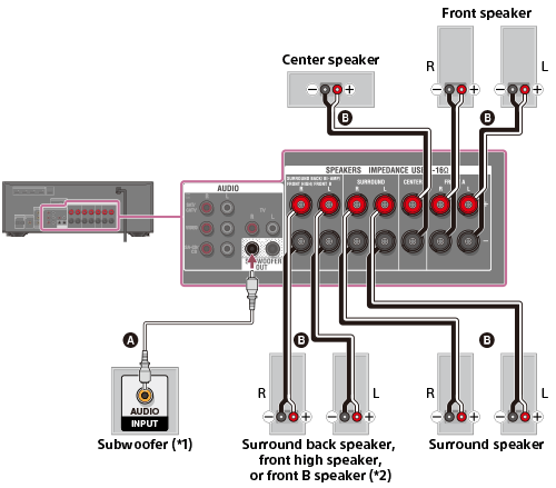 *2 Taikoma tik STR-DH750. Pastabos dėl SPEAKERS SURROUND BACK/BI-AMP/FRONT HIGH/FRONT B jungčių.