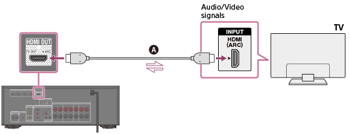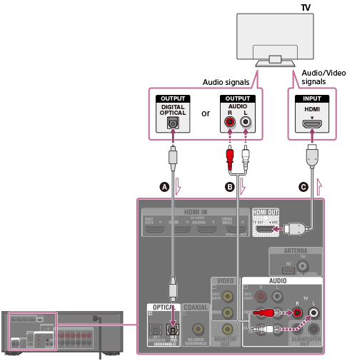 Поврзете телевизор на приклучокот HDMI TV OUT или MONITOR OUT . Можете да ракувате со ресиверов користејќи приказ на екранот ако го поврзете телевизорот на приклучокот HDMI TV OUT .