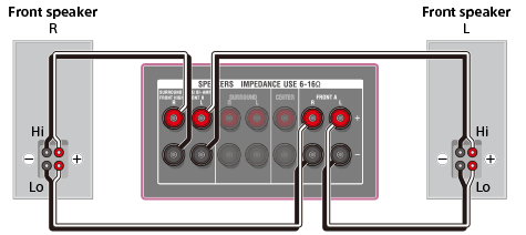 Sluit de aansluitingen op de Lo-zijde (of Hi-zijde) van de voorluidsprekers aan op de SPEAKERS FRONT A-aansluitingen en sluit de aansluitingen op de Hi-zijde (of Lo-zijde) van de voorluidsprekers aan op de SPEAKERS SURROUND BACK/BI-AMP/FRONT HIGH/FRONT B-aansluitingen.