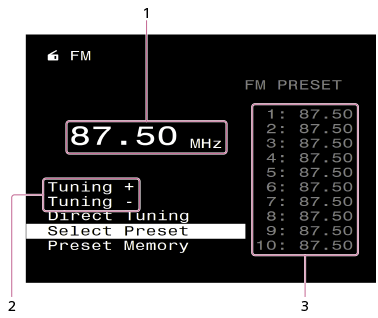 Selecteer [Tuning +] om bij het zoeken naar stations van lagere naar hogere frequenties te gaan en selecteerTuning -] om bij het zoeken naar stations van hogere naar lagere frequenties te gaan. De receiver stopt met zoeken als er een station wordt ontvangen.