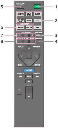 Изберете [Watch] или [Listen] от екрана на началното меню. Когато натискате тези бутони на екраните „Гледане“ или „Слушане“, може да движите фокуса, за да изберете желания вход. - CUSTOM PRESET (1, 2, 3)