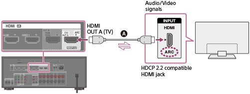 Всички HDMI жакове на задния панел поддържат разделителна способност 4K. HDMI жаковете, означени като „HDCP 2.2“ (HDMI IN SAT/CATV (MHL), HDMI OUT A (TV) (*), HDMI TV OUT (**)), поддържат Digital Content Protection System Revision 2.2 (HDCP 2.2) с широка лента.