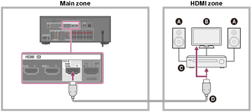 - За да използвате тази връзка задайте [HDMI Out B Mode] в менюто HDMI Settings на [Zone].