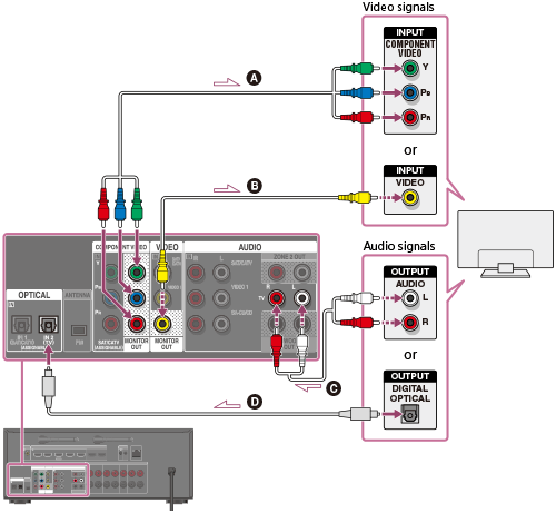 Prijunkite TV prie HDMI OUT arba MONITOR OUT lizdo. Prijungę TV prie HDMI OUT A (TV) lizdo, galėsite valdyti imtuvą naudodami meniu TV ekrane.