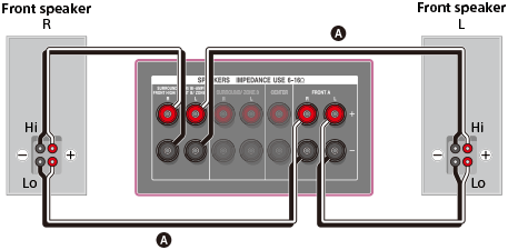 Prie priekinių garsiakalbių lizdų „Lo“ (arba „Hi“) prijunkite SPEAKERS FRONT A jungtis, o prie „Hi“ (arba „Lo“) priekinių garsiakalbių lizdų – SPEAKERS SURROUND BACK/BI-AMP/FRONT HIGH/FRONT B jungtis.