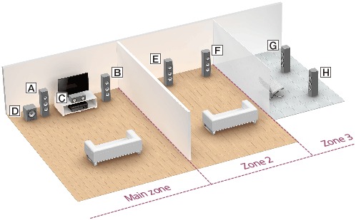 Jei garsiakalbiai pagrindinėje zonoje yra prijungti prie 3.1 kanalų jungties, 2 ir 3 zonose prijungus papildomus garsiakalbius muzikos galima klausyti ir dar dviejose vietose (2 ir 3 zonose).