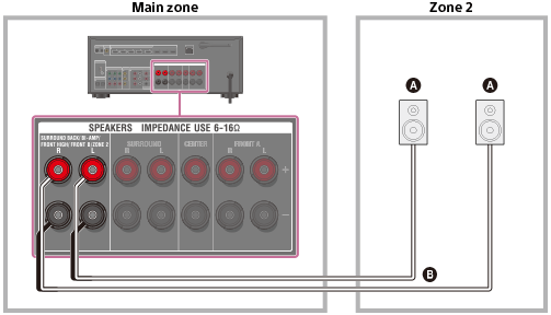 - Когато използвате тази „зона 2“ връзка, трябва да настроите изводите SPEAKERS SURROUND BACK/BI-AMP/FRONT HIGH/FRONT B/ZONE 2. За подробности вижте „Настройване на високоговорителите за зона 2 (само за STR-DN1050)“.