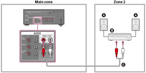 - За да използвате тази връзка, задайте [Zone2 Out] в менюто HDMI Settings на [On].