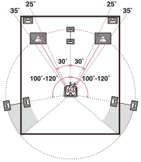 - Predné horné reproduktory umiestnite v uhle 25° až 35°.
