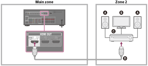 - Ak chcete použiť toto pripojenie, nastavte položku [Zone2 Out] v ponuke HDMI Settings na hodnotu [On].