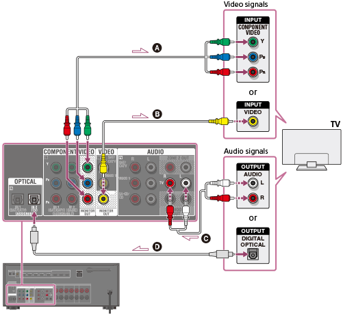 - Če želite televizor priključiti na sprejemnik prek priključka TV IN na sprejemniku, potem priključek za izhod zvoka na televizorju nastavite na [Fixed], če je preklop med možnostma [Fixed] ali [Variable] mogoč.