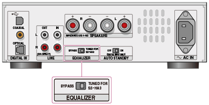 Als u de schakelaar EQUALIZER op het achterpaneel van de USB DAC AMPLIFIER instelt op TUNED FOR SS-HA3, kunt u genieten van geluidskwaliteit die is afgestemd op de aanbevolen SS-HA3-luidsprekers (niet meegeleverd). Selecteer de instelling die uw voorkeur heeft, want de werkelijke geluidskwaliteit is afhankelijk van de manier waarop de luidsprekers zijn geïnstalleerd.