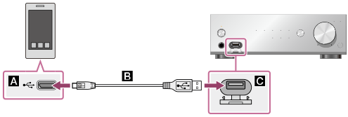 portul (USB) de pe panoul frontal al AMPLIFICATORULUI DAC USB cu ajutorul unui cablu USB (nefurnizat) pentru a asculta materialele redate de pe dispozitivul respectiv pe boxe sau la căşti. Pentru detalii referitoare la dispozitivele compatibile cu această funcţie, consultaţi „Dispozitive acceptate”.
